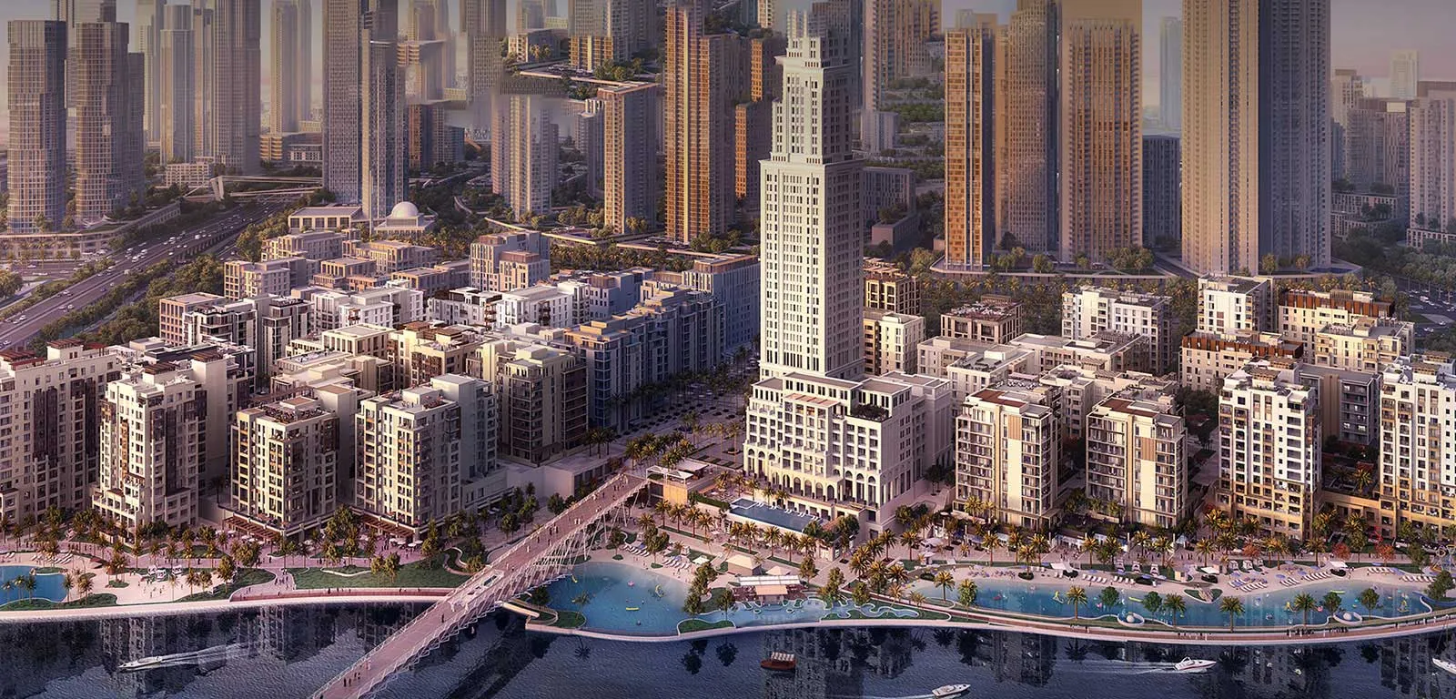 This new waterfront district, designed with sustainability and smart living in mind, spans over 7.4 million square meters. It includes premium residences, commercial spaces, green areas, and a private beach. The neighborhood will also be home to the Dubai Creek Tower, set to become one of the tallest towers in the world (exceeding 828 meters).