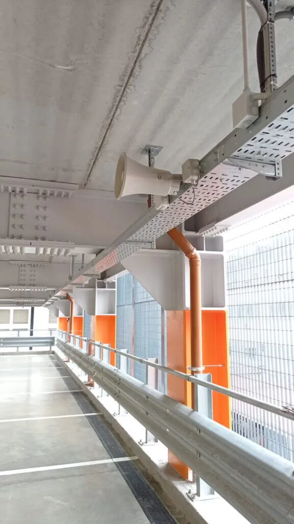 48 horn speakers, 41 wall-mounted rounds, a remote emergency call station and free-standing microphones.